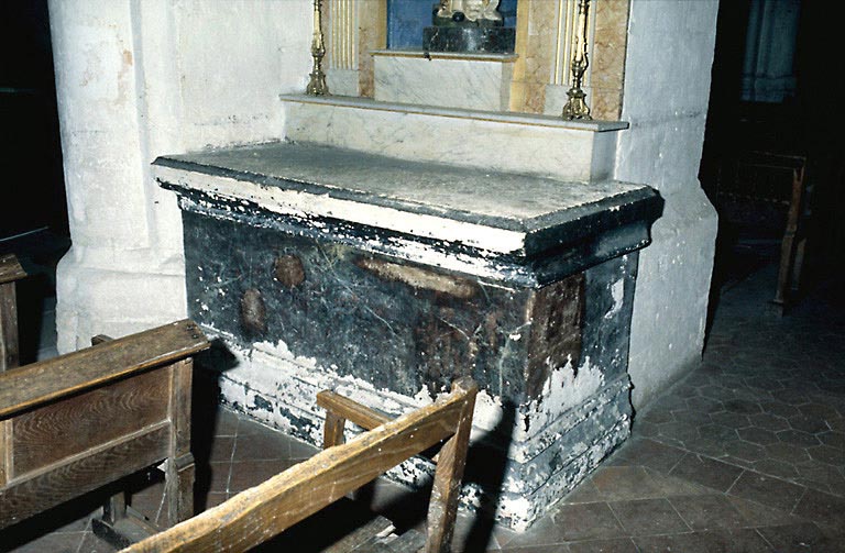 Les deux autels ne sont pas contemporains l'un de l'autre. Celui placé au sud remonte probablement au 12e siècle et celui placé au nord est plus récent, les moulures en doucine indiquent une date avancée dans le Moyen Age, sans doute dans le courant du 15e siècle.
