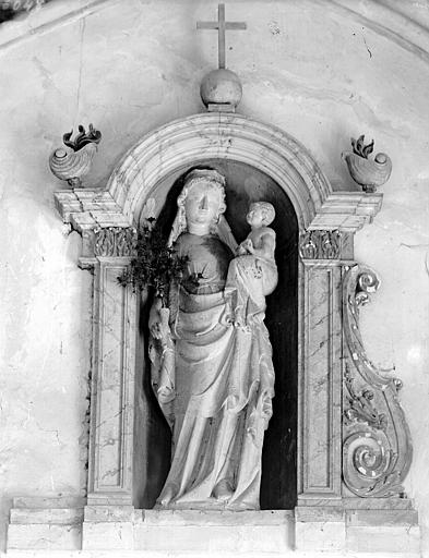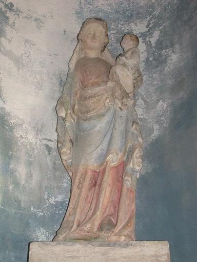 La Vierge, déhanchée, porte son Enfant sur le bras gauche et tenait une fleur de lys dans sa main droite. Elle est voilée et couronnée et porte une longue robe ceinturée sous la poitrine et un manteau ramené sous son bras gauche qui forme des plis curvilignes sur l'avant de la silhouette et s'enroule sur ses flancs. L'Enfant, torse nu, tient de ses deux mains un oiseau et lève les yeux, au contraire de sa Mère dont le regard se dirige vers le bas.