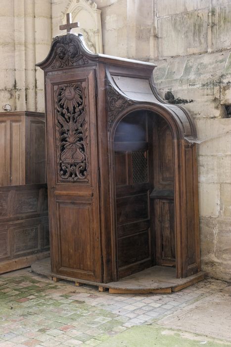 Confessionnal en bois sculpté et ciré composé de trois compartiments. Le confessionnal se compose de trois compartiments, les deux compartiments latéraux étant en retrait par rapport à celui du centre.
