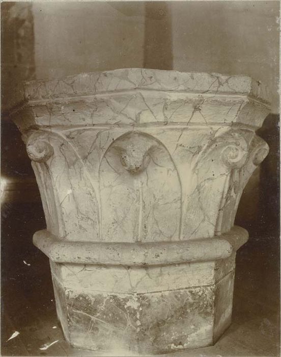 Fonts baptismaux en pierre sculptée en forme de chapiteau octogonal monté sur un support octogonal, reposant sur un astragale et couronné d'un tailloir. La cuve unique ne possède qu'une seule évacuation d'eau.