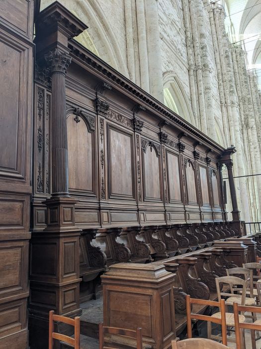 Ensemble de 48 stalles avec dossier. Deux ensembles de 24 stalles réparties de chaque côté de la dernière travée de la nef. Chaque dossier est divisé en sept panneaux, séparés par des pilastres couronnés de chapiteaux corinthiens, alternativement carrés et rectangulaires tous à sommet cintré.