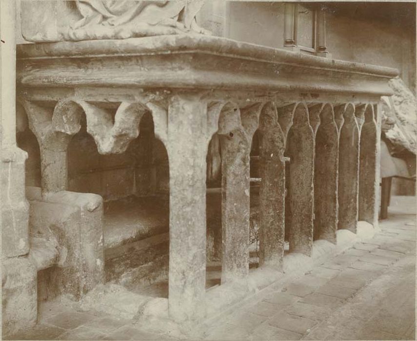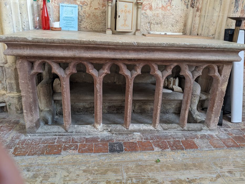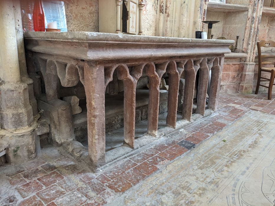 Table d'autel en pierre sculptée portée par six arcatures trilobées sur le devant et trois arcatures sur les côtés.