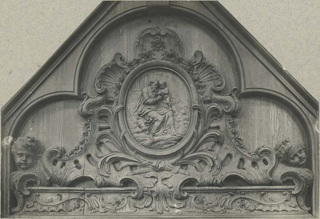 Joseph et l'enfant Jésus dans le médaillon entouré d'un décor rocaille dans le fronton.