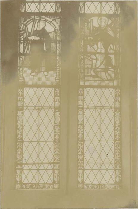 verre transparent (coloré) : peint, grisaille sur verre, jaune d'argent ; plomb (réseau)