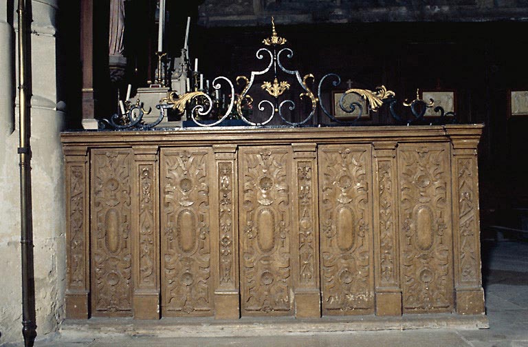Chaque élément de la clôture se compose de cinq panneaux séparés par six pilastres et assemblés par rainures et languettes. Les parties en chêne reçoivent en couronnement une ornementation en fer forgé. Deux ouvrants pour la clôture de choeur, un ouvrant par chapelle.
