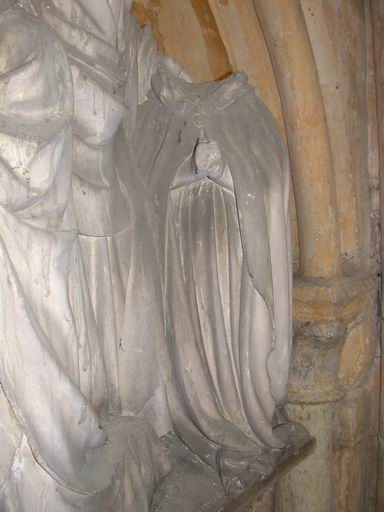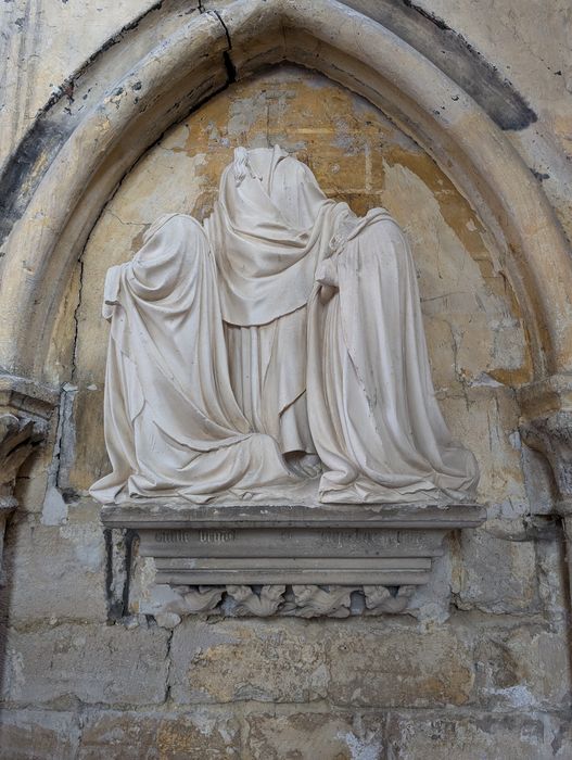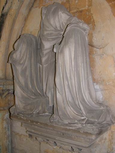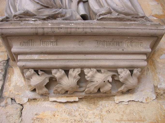 Groupe découvert vers 1912 sous un autel. Le groupe sculpté du 1er quart du 15e siècle, par son matériau et son style, est à rapprocher de la statue de sainte ou Vierge de l'Annonciation, présente à côté dans la même église.'Les préjudices subis, sans doute à l'époque révolutionnaire, laissent planer certains doutes sur un ensemble - vraisemblablement commémoratif et non funéraire - dont nous ignorons la composition originelle et l'emplacement initial (...). Les Brunel, propriétaires en ce lieu dont ils étaient sans doute originaires (on les y suit depuis le début du XIVe siècle), avaient choisi pour nécropole familiale l'église où l'un des leurs avait fait une fondation et où plusieurs dalles gravées rappellent encore leur mémoire. (...) Membre de l'entourage du roi, Guillaume Brunel a pu faire appel à un artiste parisien, qui s'insère de façon assez personnelle dans le courant artistique de son temps : l'apôtre est drapé de manière peu innovante, mais les autres effigies dépendent nettement du gothique international. Elles présentent des affinités avec des ouvrages par ailleurs assez divers et ont été rapprochées des sculptures de La Ferté-Milon.' (F. Baron)