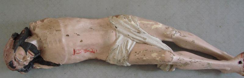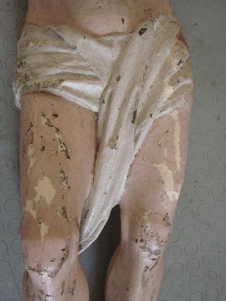 Christ en croix en bois sculpté et peint, dont les bras ont disparu, et sa croix en bois sculpté de branches écotées.