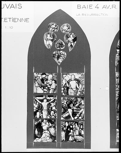Verrière du 16e siècle restaurée au 19e siècle. Le panneau de la Dormition provient de la baie 1. Le panneau de la Résurrection est moderne de même que la Vierge de la lancette gauche.