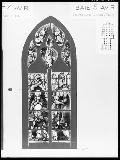 Dans la lancette de gauche, au registre inférieur, la Vierge (moderne) avec une famille de donateurs figurés sous un dais architecturé où sont figurés Adam et Eve. Au registre supérieur, la Résurrection (moderne). Le Christ sort de son tombeau, deux soldats armés l'un d'une lance et l'autre d'un arc le regardent s'élever au ciel. Une famille de donateurs est agenouillée en partie inférieure du panneau. Dans la lancette de droite, au registre inférieur, la Visitation sous un dais architecturé avec représentation à gauche de saint Michel terrassant le dragon et à droite d'un autre saint. Au registre supérieur, la Dormition de la Vierge. Au tympan, l'apparition du Christ à la Madeleine avec des anges musiciens et chanteurs.