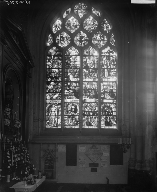 Transcription : ' Comment sainct Eustache fut converti à la foy de Jésus-Crist. 1554.-Eustace marchant et bourgois de Beauvais a donné ceste verrière peschés / 1554 / Soudain il en partit au plus hault des montaignes, / or il erroit aux boys loing des gens et bruyct, / ores dedans les prés et parmi les campaignes, / de sa femme et enfans seulement estant suyct. / Après ses biens brulez et toute sa finance, / Sainct Eustache rendit ses lieux lesplus secrets/en suivant le bon Job l'honneur de patience / Graces en re à Dieu sans soupirs et regrets. / Mahiot Borcard a conné cette vitre lequel trespassa le 5e jour d'avril 1552. Prize Dieu pour Luy. / Jehan de Malinguehen naguère maire a donné cette partie de verrière et se recommande a vos bonnes prières '.