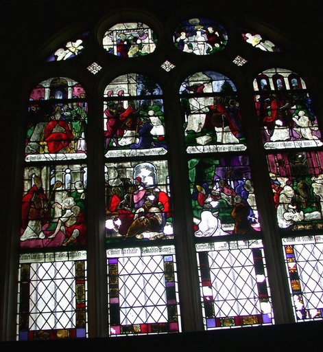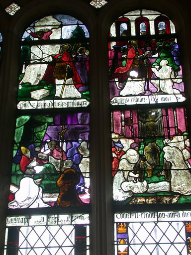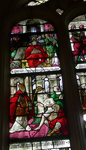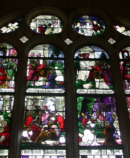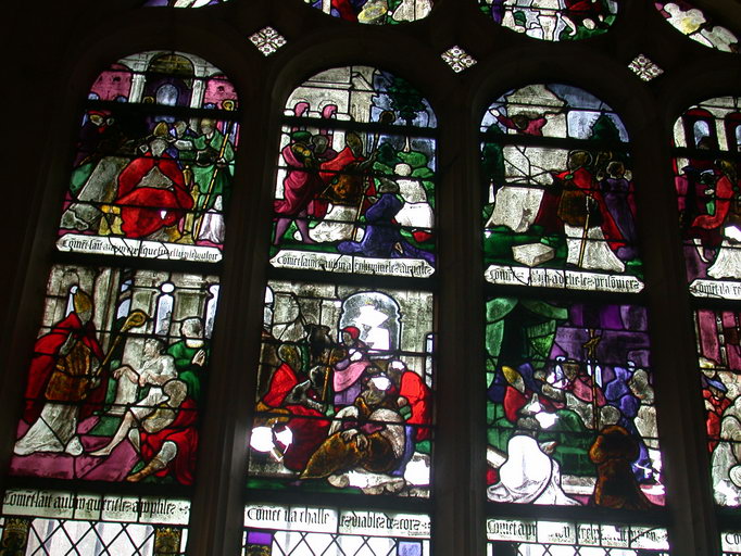 Les verrières peuvent être datées vers 1530. Il semble que les deux derniers panneaux, celui de la mort du saint et du saint malade aient été inversés. E. Rayon décrit la verrière avec des inscriptions placées dans l'ordre chronologique de l'histoire, c'est-à-dire, la scène du saint malade, légendée ' comment il rendit son âme à Dieu ', puis la scène où il est mort et mis en terre légendée ' comment après son trépas il fut mis en sépulture '. Cette inscription a aujourd'hui partiellement disparu, le verre étant brisé.