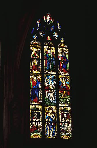 POP | Plateforme ouverte du patrimoineverrière figurée (baie 1) : saint Louis et donateurs, sainte Barbe, Baptême du Christ, sainte Marguerite, saint Pierre, saint Antoine (?), saint Jacques, Christ de Pitié, anges aux instruments de la Passion