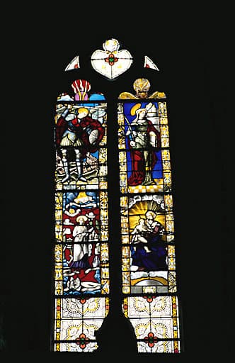 verrière (baie 0) : Vierge à l'Enfant, Vierge des litanies, Saint Michel, Sainte Barbe