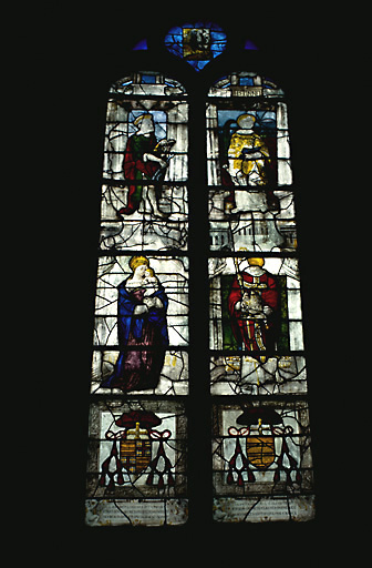 POP | Plateforme ouverte du patrimoineverrière figurée (baie 1) : Vierge à l'Enfant, saint Denis (?), saint Pierre, saint Etienne