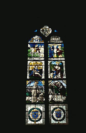 POP | Plateforme ouverte du patrimoineverrière figurée (baie 4) : Vierge de Pitié, Calvaire, Charité de saint Martin, saint François d'Assise, saint Christophe, saint Nicolas