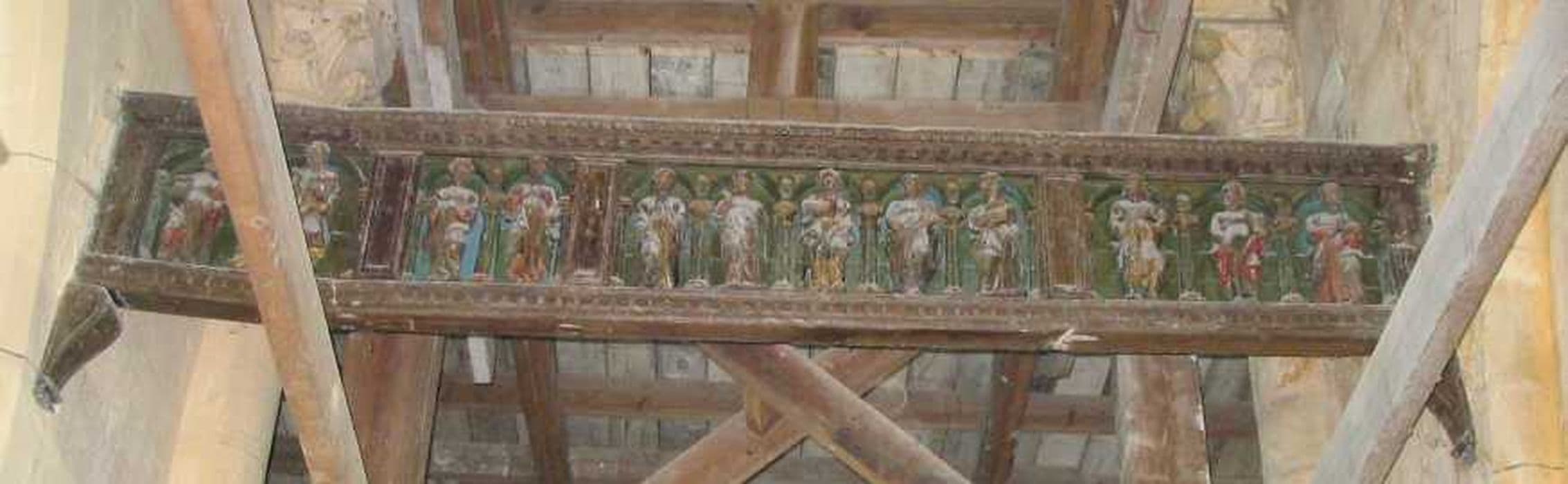poutre à logettes avec les statuettes des douze apôtres et le visage du Christ sur le linge de sainte Véronique