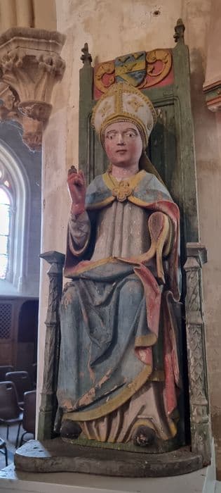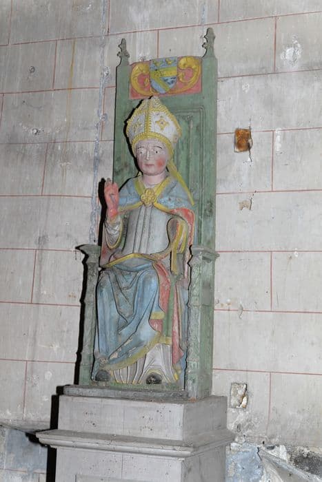 Statue de saint Claude représenté assis sur un trône surmonté d'armoiries.