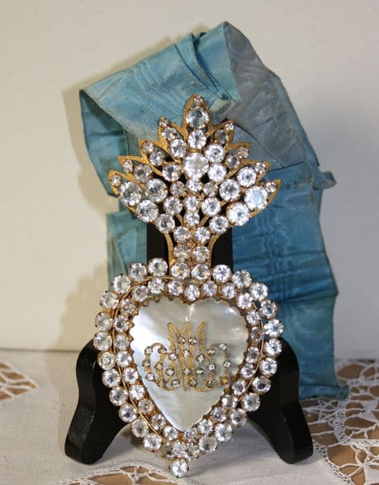 Coeur de dévotion avec ruban de moire bleu et verroterie. Laiton : doré, nacré