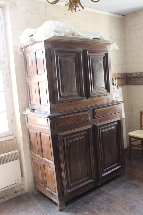 Buffet à deux corps en chêne sculpté, teinté et ciré, avec deux faux tiroirs en façade.
