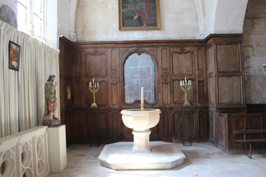 Fonts baptismaux taillés dans le calcaire avec traces de badigeon blanc, avec un couvercle en chêne et ferrures en fer forgé.