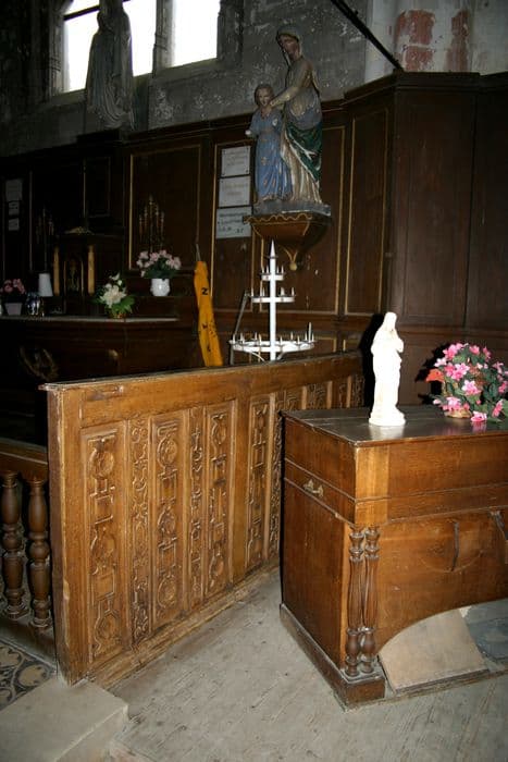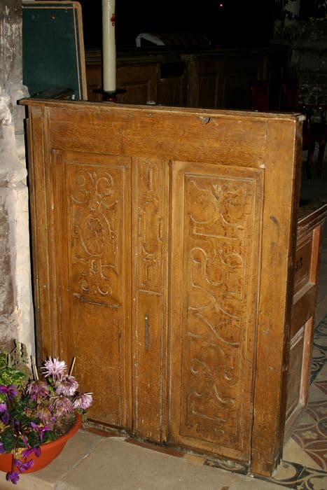 Fragments de l'ancienne clôture de choeur en bois sculpté avec surpeints en faux bois. Deux séries de panneaux comprenant 1 pilastre et 2 panneaux pour la partie gauche et 6 pilastres et 9 panneaux pour la partie droite.