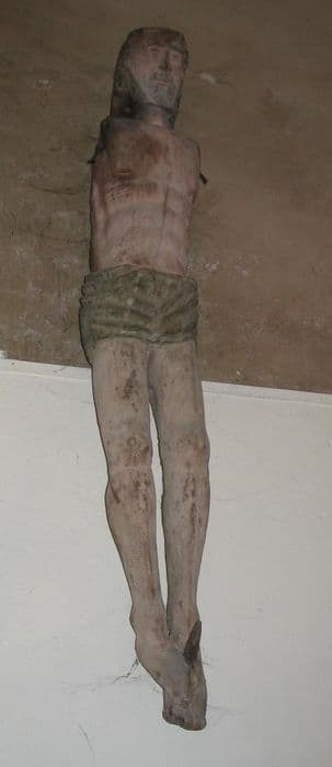 Christ en croix en bois taillé, dos ébauché, avec traces de polychromie, à laquelle manquent les deux bras, la couronne d'épines, les orteils du pied droit et le pouce du pied gauche, et fendue dans le sens de la hauteur à partir du périzonium.