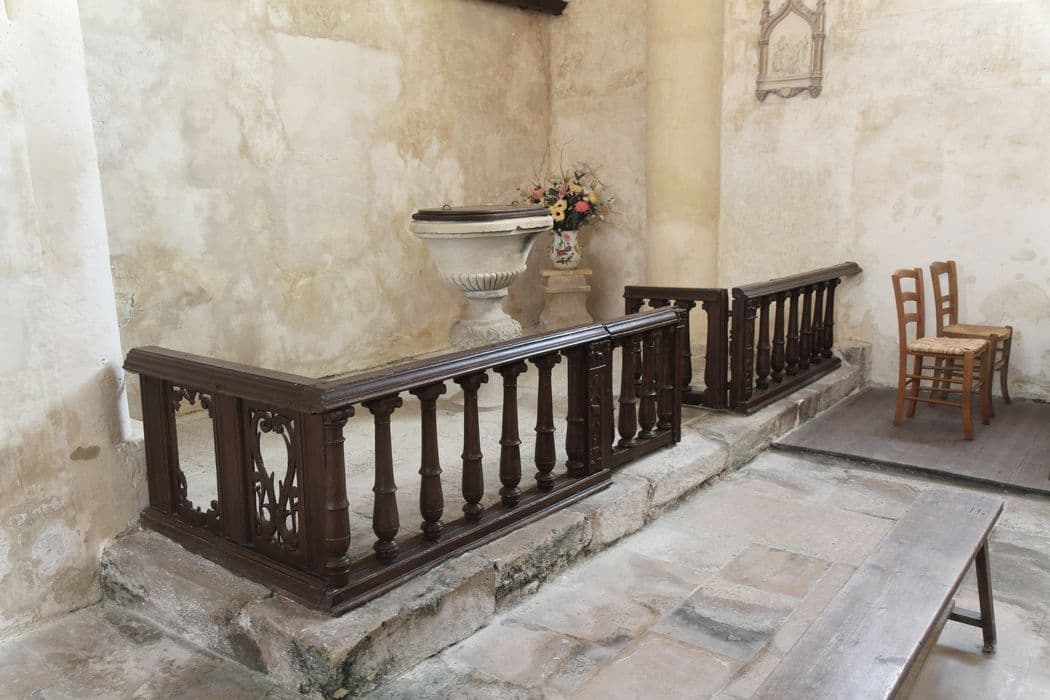 Clôture de baptistère peinte façon faux bois, avec ensemble de balustres et pilastres.
