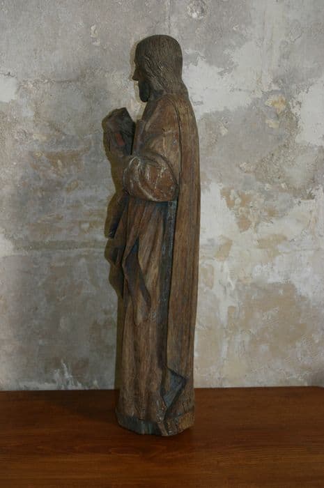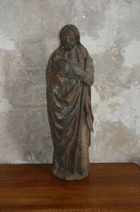 Statue en bois taillé (revers plat) et peint (traces de polychromie) où manque le haut du bâton et à la base de laquelle sont visibles les traces d'insectes xylophages.