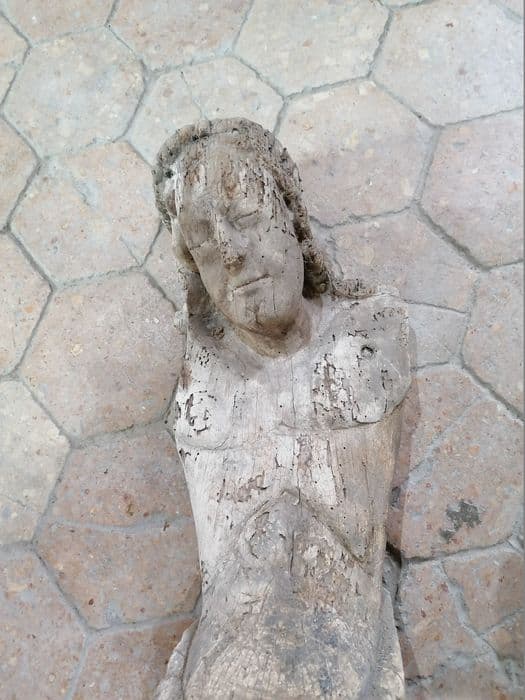 Statue en bois taillé et peint avec traces de polychromie. ; mutilée, il y manque les bras et la partie inférieure du corps, et certaines zones sont vermoulues.