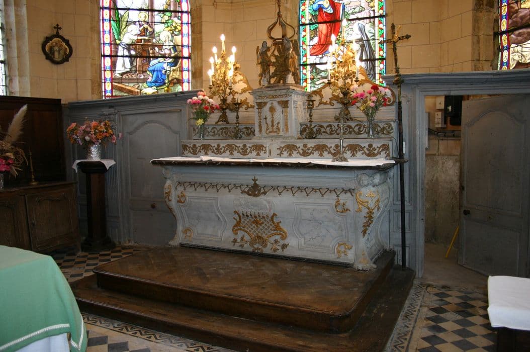 Bois taillé, décor en bas-relief, décor dans la masse, peint gris, faux marbre, dorure. Autel composé d'une table, de deux gradins, d'un tabernacle et d'une exposition.