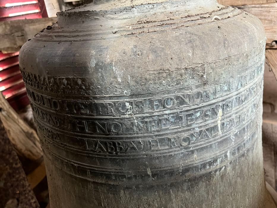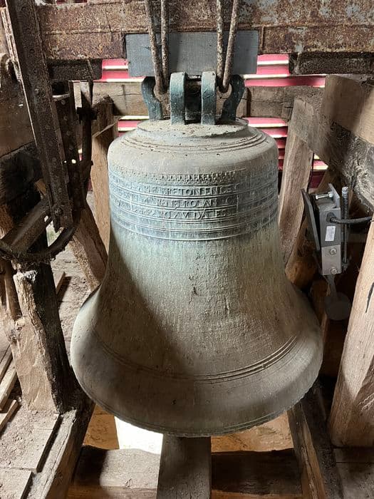 Anse de type couronne : six anses aux arrêtes droites, sans décor. Frise avec décor formé d'une alternance de fleurs de lys et de palmettes dressés. Inscription posée sur cinq bandeaux. Note : sol 3. Battant ancien déposé dans le choeur.
