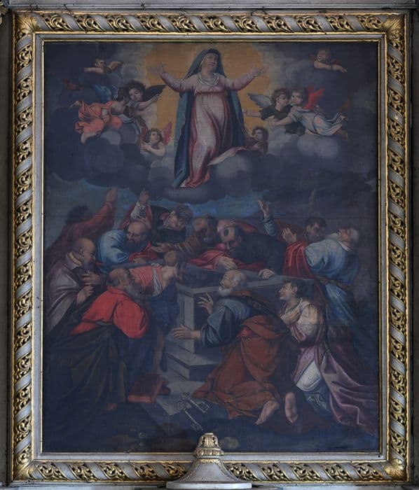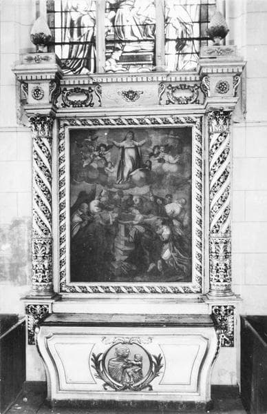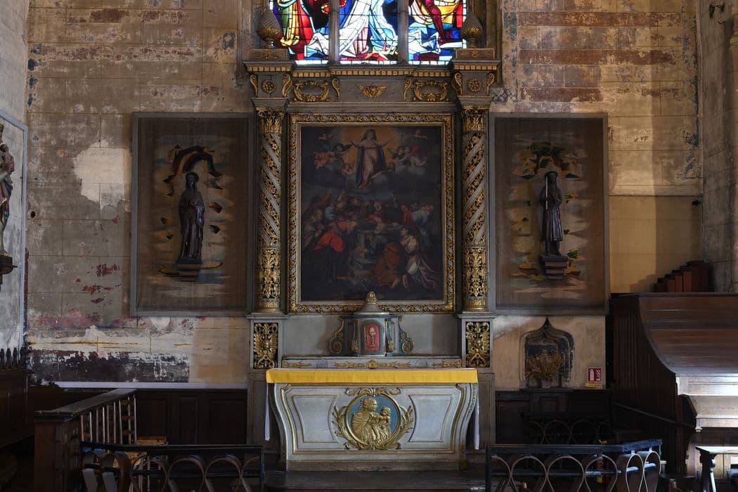 Autel latéral avec deux colonnes torsadées dont le décor floral est ajouré. Toile l'Assomption de la Vierge (h = 200, la = 230) datée de 1698 encadrée de deux colonnes à bandes torsadées supportées par deux piliers décorés d'une tête d'angelot.