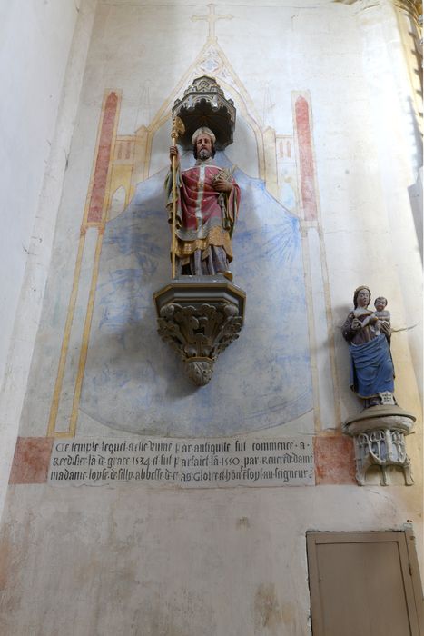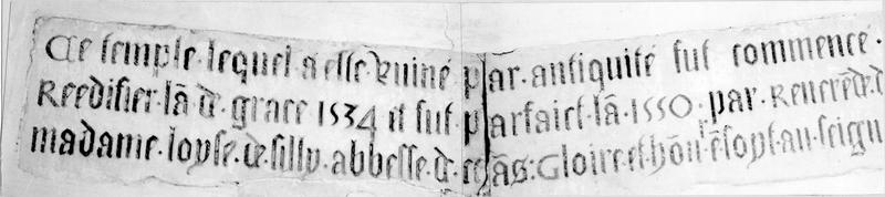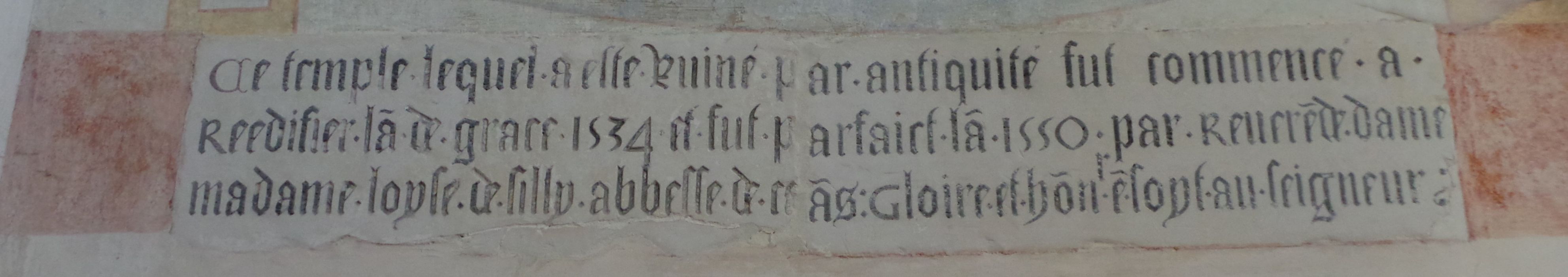 Inscription, date : Ce temple a esté ruiné par antiquité fut commencé a réédifier l'an de grâce 1534 et fut parfait l'an 1550 par révérende dame Madame Loyse de Silly, abbesse de Céans : Gloire et honneur en soyt au seigneur (en caractères gothiques).