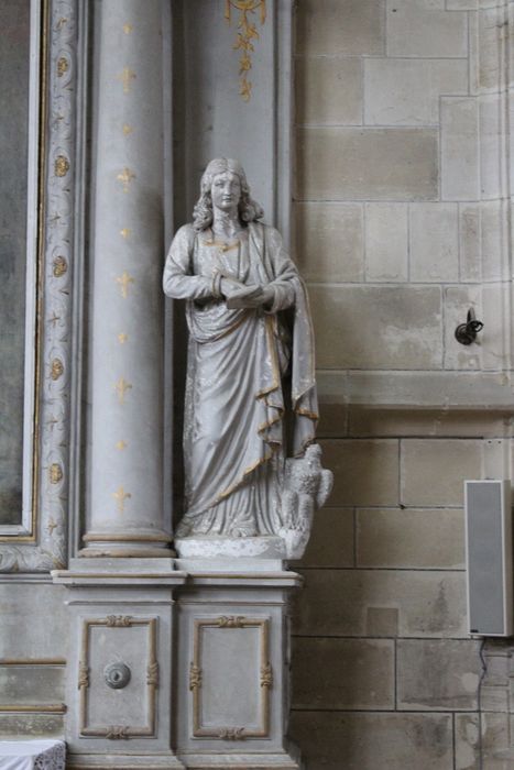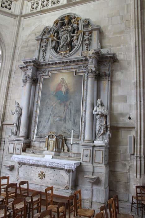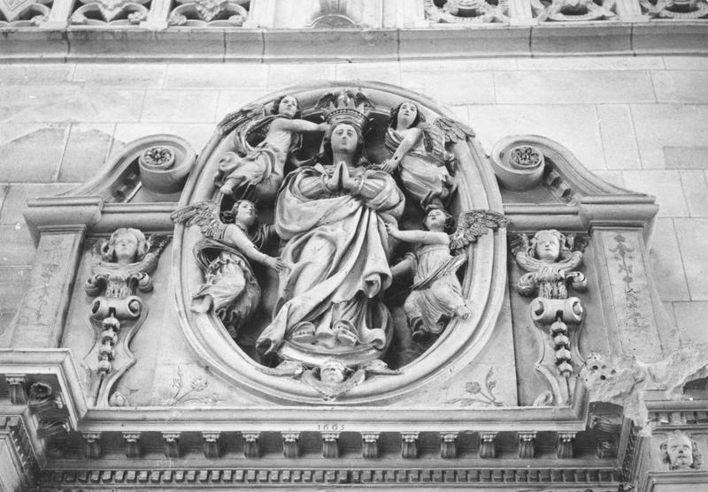 Le couronnement est orné d'un médaillon ovale de grandes dimensions dans lequel se trouve un haut-relief en terre cuite représentant le Couronnement de la Vierge.