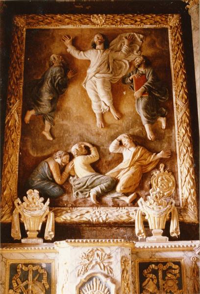 maître-autel, retable, tabernacle, demi-relief : La Transfiguration, 2 statues : Saint Godegrand, Sainte Opportune