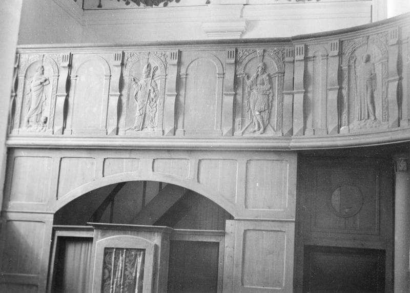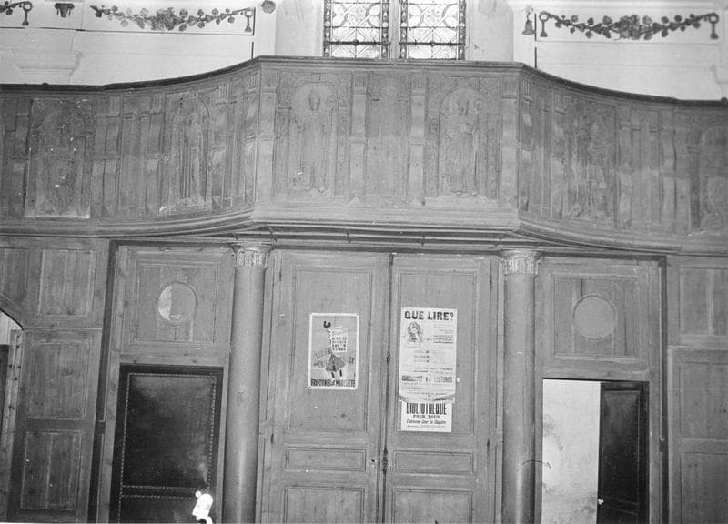 La tribune est supportée en son centre par deux colonnes avancées. Une dizaine de personnages sont sculptés en faible relief sous arcade vide entre chacun d'eux.