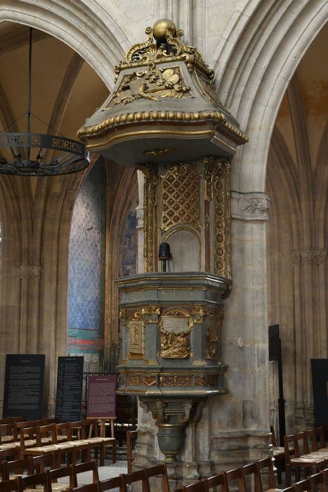 Cette chaire est en pierre blanche en partie dorée, à sujets du Nouveau Testament en reliefs. L'escalier est pratiqué dans l'épaisseur du pilier contre lequel elle s'appuie.