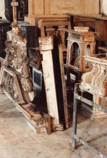 Ce maître-autel se compose d'un retable à trois corps ; le corps central est encadré de colonnes torses et surmonté d'un fronton brisé supportant deux angelots ; les corps latéraux présentent des pilastres, ainsi qu'un fronton très orné, couronné d'une tête d'angelot, en bois sculpté, peint et doré. Au sud, une huile sur toile de 1742, signée Grandrivière, représente saint Augustin. Le tabernacle comporte des colonnettes torses et des petits panneaux peints. L'antependium est à décor de rinceaux et d'angelots ; au centre, une huile sur toile du 18e siècle représente le sommeil de l'Enfant Jésus.