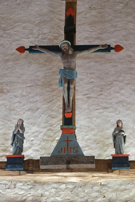 Poutre de gloire et calvaire formé du Christ en croix encadré de deux statuettes, la Vierge et saint Jean.