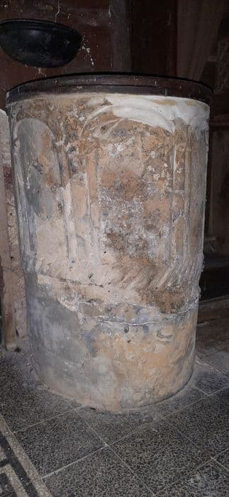 Cuve baptismale cylindrique à décor d'arcature en bas-relief.