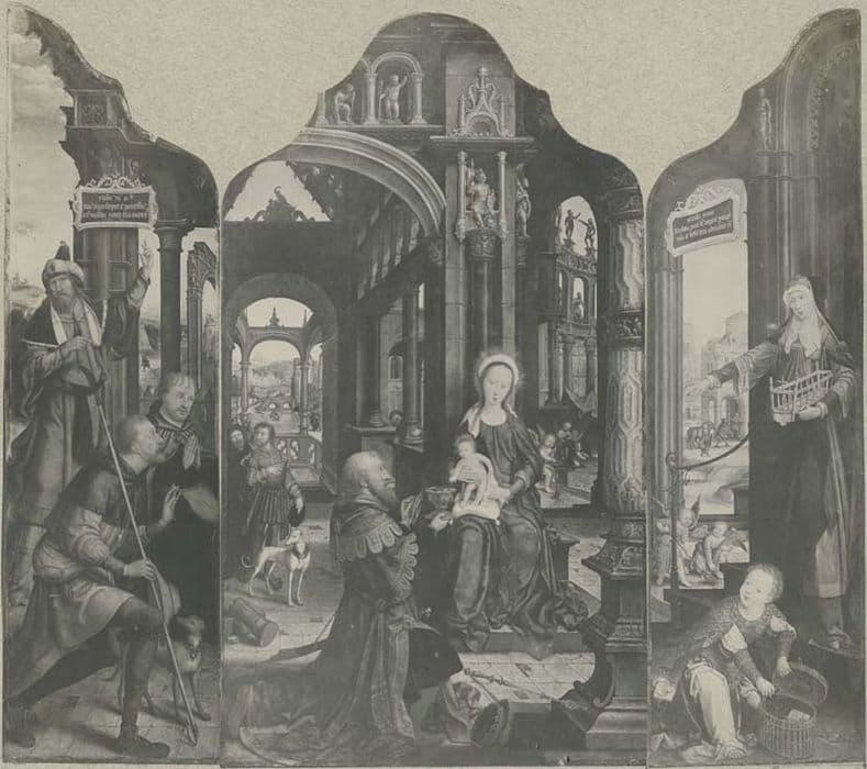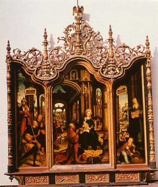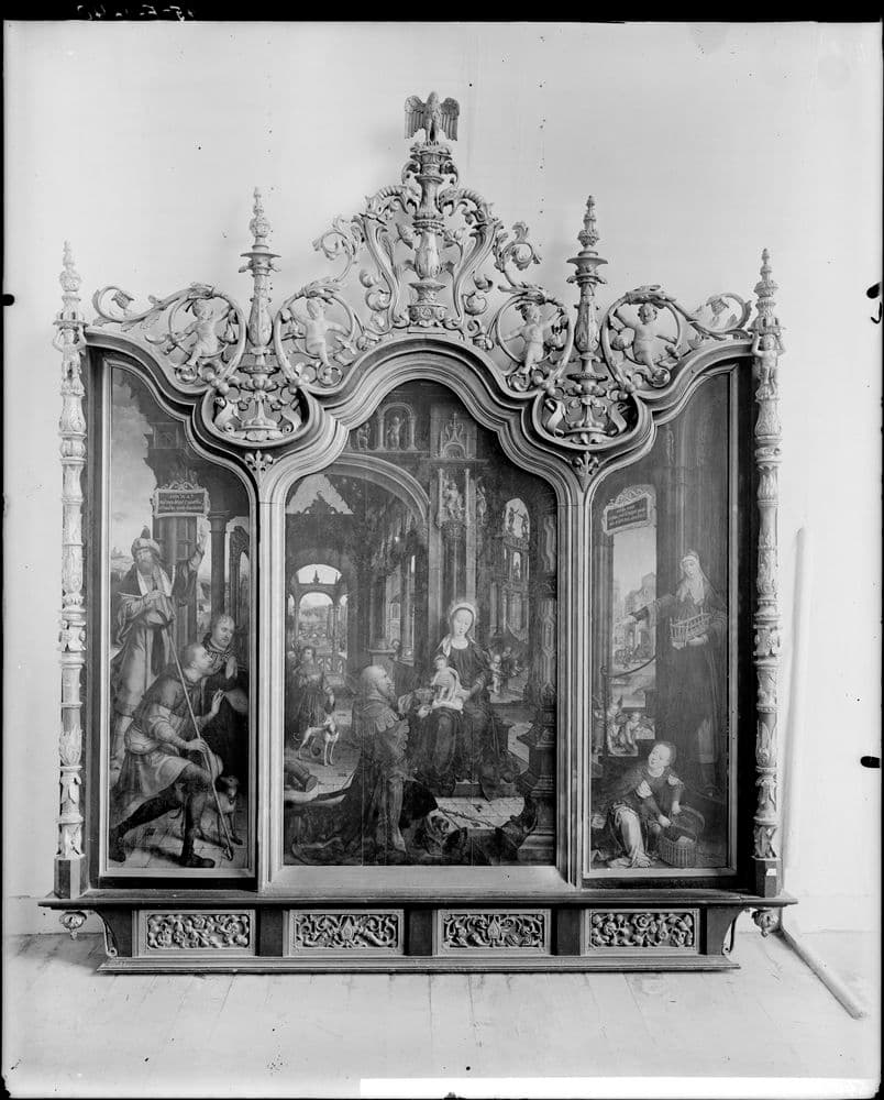 Restauration des cadres entourant les panneaux peints par Maxime Chiquet en 1973 (suivi Colette Di Matteo). Cadres du 16e siècle en bois sculpté, couronnement ajouré, doré. Petits personnages polychromés, parties planes et colonnes à superposition d'éléments sculptés. Cadre du panneau de l'Adoration de l'Enfant (h = 230 ; la = 200 ) : dépose, mise sur cadre, emballage et transport en atelier, remise en état de parties disjointes et des assemblages, ajustage, goujonnage, tenons et collage. La crête est une sculpture ajourée d'une très grande finesse. Réparation de très nombreuses parties ne tenant plus ou d'autres actuellement retenues entre elles par des ficelles ou des fils de fer. Partie axiale composée d'une grande bobêche surmontée d'un oiseau ailes déployées, les pattes reposant sur un petit cochon avec en accolades, deux chimères (66 cm). Réparation de tous les points de liaison avec passage de tenons très fins dans les parties les plus solides. Crête de la chimère gauche : bobèche dans l'axe du bâti de cadre séparant le panneau peint central et le panneau peint en latéral. Bobêche avec éléments sculptés à la base et deux philactères en côté (hauteur 66 cm). Réparation de tous les points de liaison avec paasage de tenons très fins dans les parties les plus solides. Grands rinceaux intermédiaires avec enfant assis dans la partie inférieure (h = 70 cm). Réparation de tous les points de liaison avec passage de tenons très fins dans les parties les plus solides. Sculpture du rinceau gauche en partie supérieure : traitement insecticide et durcissement du bois par emplissage de la gomme laque. Nettoyage des colonnes sculptées (h=145 cm). Restauration de polychromie et dorure de la traverse inférieure de panneau peint en partie latérale. Restauration de la dorure comprenant le nettoyage de toutes les parties pourries et toutes sujétions. Moulure des cadres des trois panneaux peints, raccords de l'ensemble. Ecoinçon à la rencontre des moulures. Crête : grande bobêche axiale. Grande chimère d'accolade. Ciseau et petit cochon. Bobêche dans l'axe de bâti de cadre. Bobêche terminale des colonnes sculptées en parties latérales. Grand rinceau intermédiaire. Restauration de polychromie. Enfant assis. Mise sur cadre, emballage, transport et remise en place. Cadre de panneaux - Le Christ aux bourreaux (h= 200 ; la=200) : dépose, mise sur cadre, embllage, transport en atelier. Remise en état des parties disjointes et des assemblages, ajustage, goujonnage, collage. Crête : sculpture ajourée d'une très grande finesse, réparation de très nombreuses parties ne tenant plus ou retenues par des fils de fers ou plaquette de zinc. Fleuron : réparation. Bobêche située au creux de la moulure de cadre entre les fleurons (h=45 cm). Chérubin ailé, rinceau et chimère en parties latérales gauche et droite au creux de la moulure de cadre (la=36 ; h = 30 cm). Chimère entre bobêche et partie inférieure du fleuron (h=36 cm). Chérubin ailé avec rinceau et chimère (h=42). Traitement insecticide du bois et consolidation par emplissage à la gomme laque. Nettoyage des colonnes sculptées (h=145). Restauration de polychromie et dorure de traverse inférieure de cadre, raccords. Restauration de la dorure comprenant tout le nettoyage des parties pourries et toutes sujétions. Moulure des cadres des trois panneaux peints, raccords. Ecoinçon à la rencontre des moulures - coeur - chérubin ailé assis tenant un écusson armorié. Crête : fleuron, bobêche, rinceau et chimère en parties latérales gauche et droite au creux de la moulure des cadres, chimère entre bobêche et partie inférieure du fleuron, rinceau et chimère de part et d'autre de l'accolade axiale, bobêche en couronnement de dais. Restauration de polychromie pour l'Enfant, chérubin ailé. Total : 36 515 fr. Restauration de trois peintures sur bois présentées en triptyque : Adoration de l'Enfant, Bergers et le prophète Isaï, La Sibylle de Samos par O. Binenbaum en 1973 : démontage du parquet défectueux, redressement des planches et réfection des joints avec goujons, contrecollage sur panneaux neufs traités, nettoyage et enlevage des repeints, restauration pour 2281fr40.