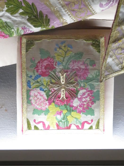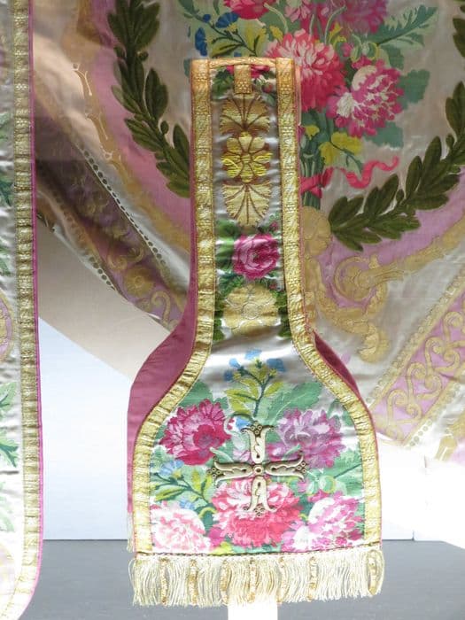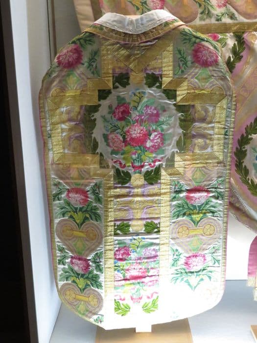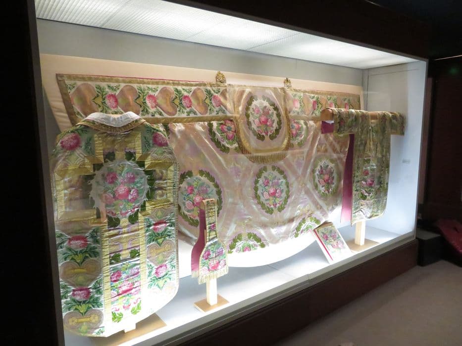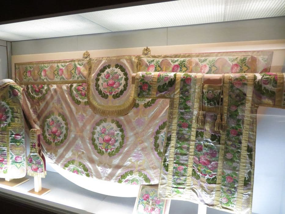 2 chasubles, 7 chapes, 8 dalmatiques, voile huméral, grémial (ornement pontifical dit ornement du roi)