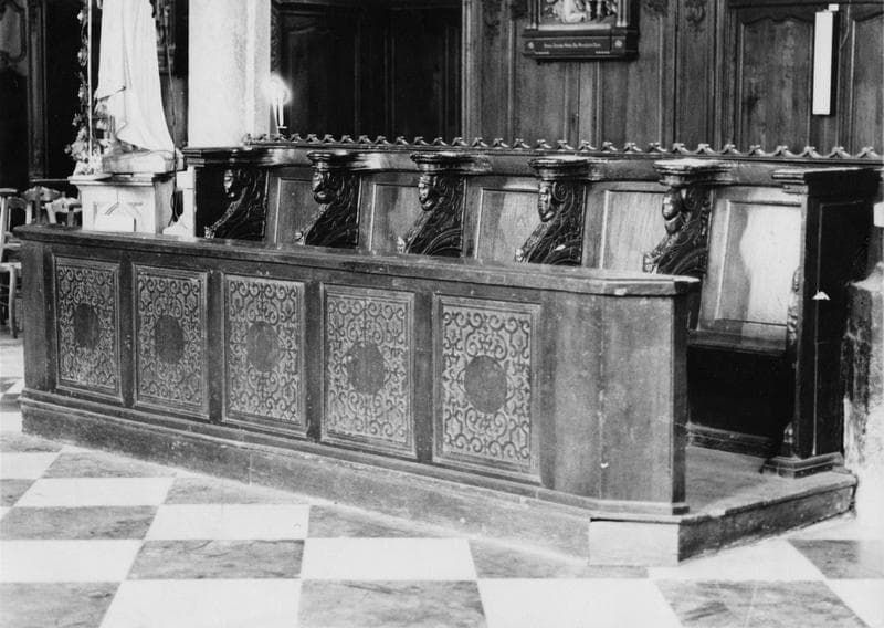 Six stalles. Deux groupes de trois stalles, deux groupes de cinq stalles, deux bancs de confrérie.