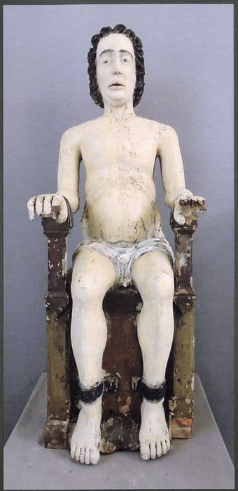 9 statues : Christ en croix, saint Pierre, saint Michel, saint Jean-Baptiste, saint Roch, saint Quentin, saint Hubert, saint Laurent, sainte Catherine