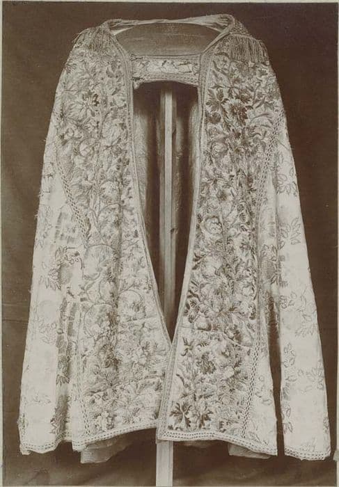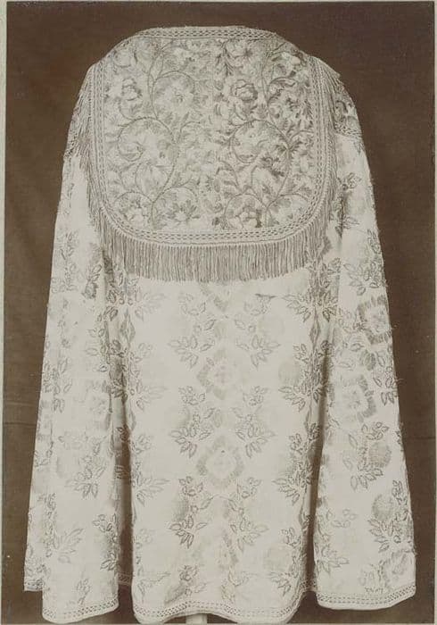 Soie blanche à décor broché vert et or et soie brodée de rinceaux et de fleurs polychromes sur fond or.