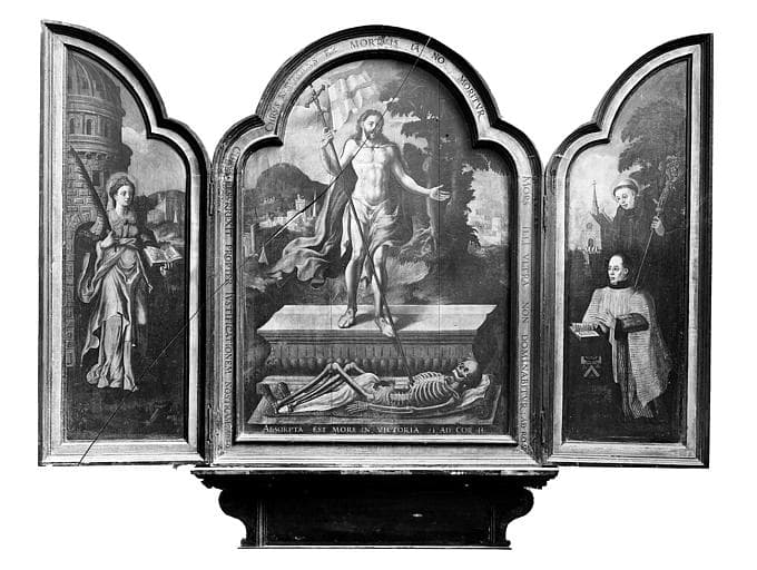 Tableau (triptyque) : Résurrection du Christ, sainte Barbe, saint Robert et le chanoine Robert de saint Martin, donateur