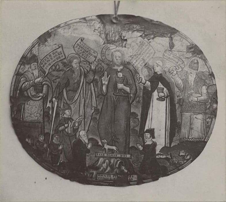 ex-voto : Christ entre saint Paul saint Thomas d'Aquin Melchisedech et Aaron et les donateurs