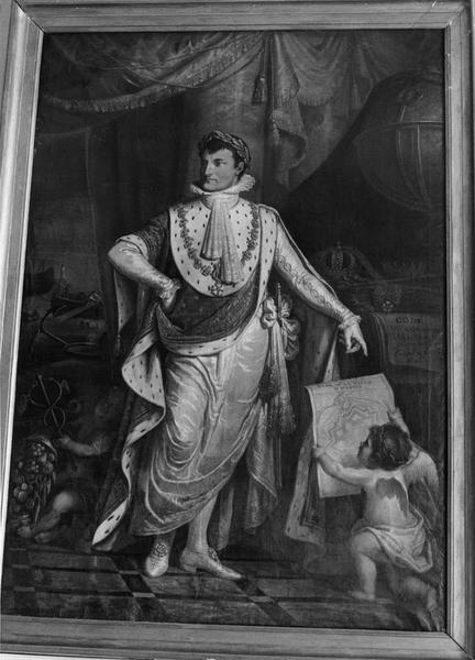 Portrait en pied de l'empereur, en costume de sacre, portant le grand collier de la Légion d'Honneur, un ange présentant le plan de la ville d'Hesdin.