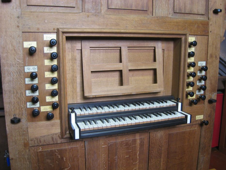 La console, du 19e siècle, est reliée à un seul clavier manuel, en tilleul. Les remaniements opérés sur l'instrument ont fait disparaître les quelques accessoires qui l'agrémentaient : rossignol, grelots, vielle.