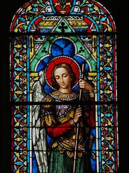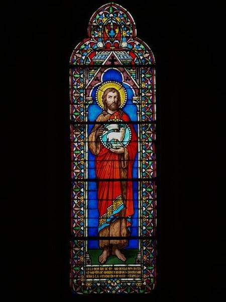 Ensemble de 5 verrières figurées : Saint Jean-Baptiste, saint François d'Assise, sainte Elisabeth, saint Joseph père nourricier du Christ, saint Michel terrassant le démon